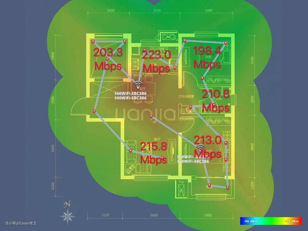 那么下边这个热力图结果就非常让人满意了。可以看出信号最好的地方自然是靠近路由器的地方,最好的数据能达到-17,就是分路由旁边那个位置。主路由旁边也不错,是-25。其他各点位最高值是图里右上角的-55,也优于理想信号强度要求-70。