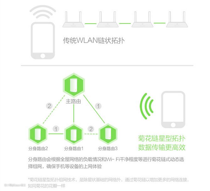 官方介绍说2.4G和5G,主路由与分路由多路信号合并为一个Wi-Fi名称,无需手动选择及切换。采用先进的菊花链星型拓扑组网技术,相比于传统WLAN链状拓扑,传输“抄近路,上网更高速”。