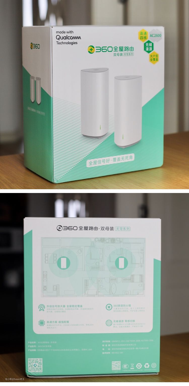 箱体使用了360传统的白绿配色,除了机体证件照之外,正面显眼处标注着卖点:高通四核,AC2600,无缝漫游,大户型全覆盖。“全无信号好,覆盖无死角”,这数来宝似的广告词很是朗朗上口。