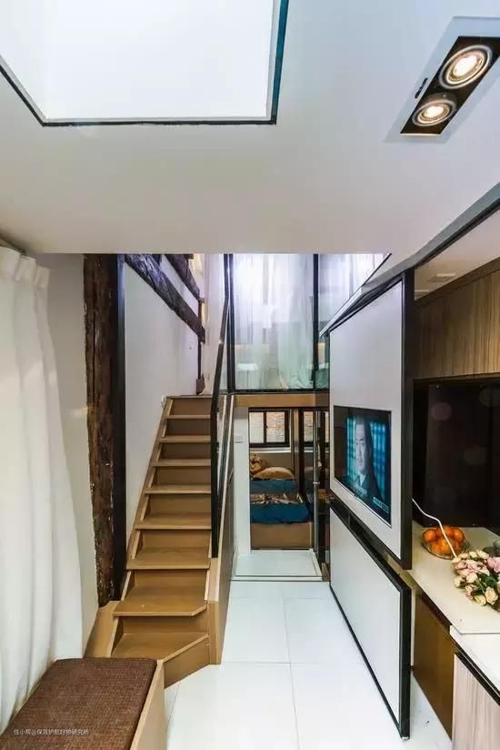 客厅中心的走廊线在2.2米的空间局限里,竟完全不显狭小,同时可容纳多人来往。并且设计师在两侧安置了折叠家具,需要时在客厅空间还能衍生出其他需要的功能区域。同时在客厅角落增设楼梯,轻松变出loft之家。