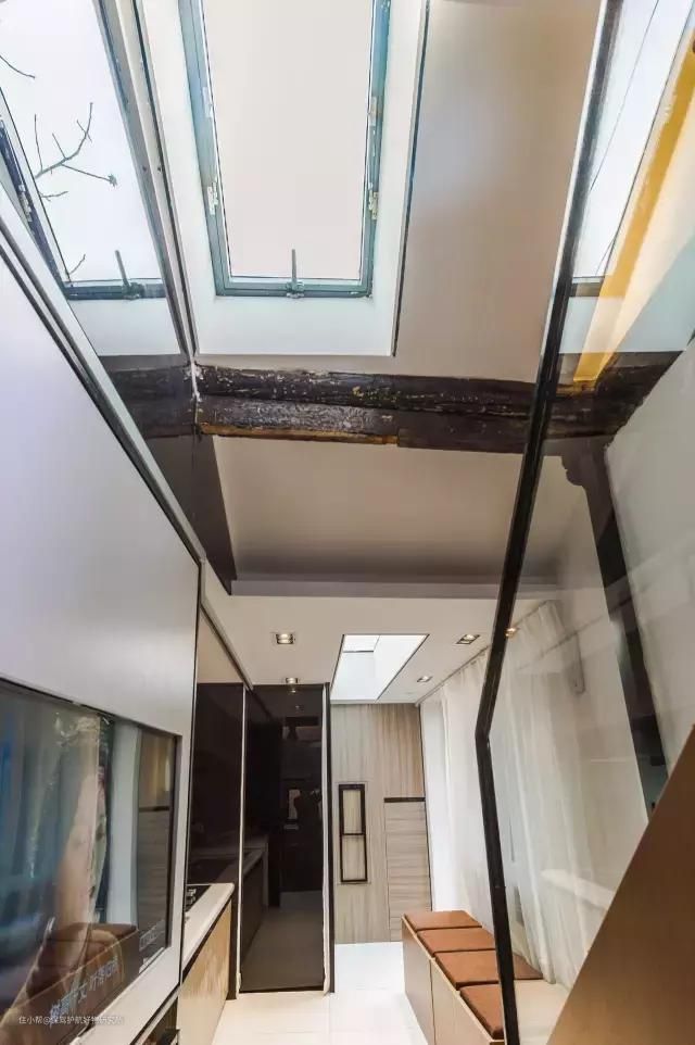 房屋顶部设了天窗,让整个房间温暖、明亮。顶部除了用混凝土重新浇灌外,在吊顶内部也加设了岩棉,起到降噪、保温的作用。