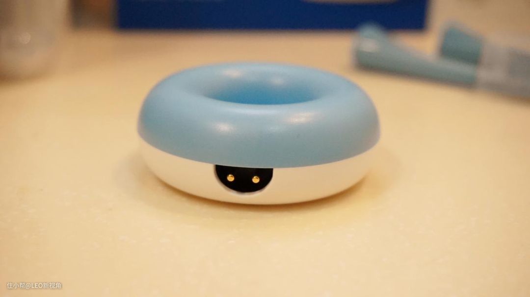 充电底座是一个甜甜圈造型的设计,圆润萌趣,而且牙刷底部有一个缺口,可以快速定位,即使孩子自己充电也不用担心移位。充电时,牙刷机身上的LED显示屏会有充电显示,一目了然。