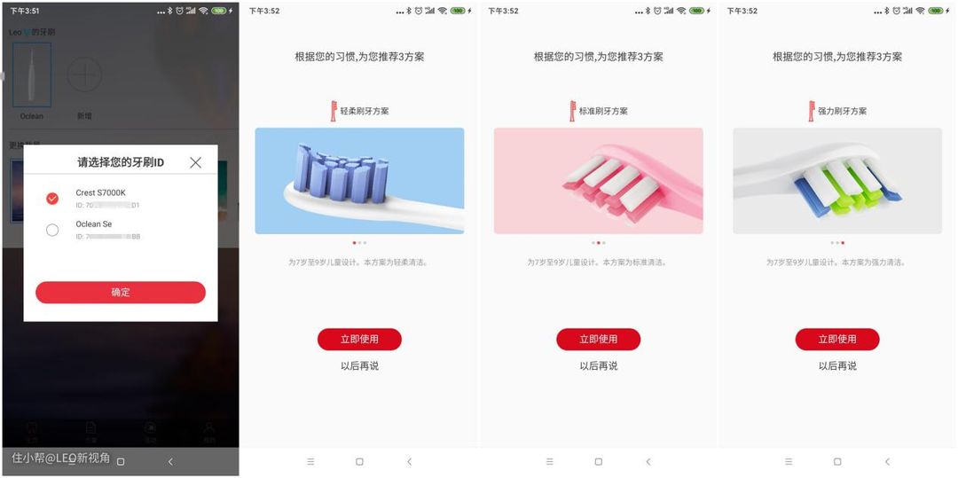 在孩子熟悉了这款牙刷后,后续也可以自己调整刷牙方案,初始方案、轻柔方案、标准方案和强力刷牙方案。当然,如果无法选择,可以有一个智能推荐。但在选择这些前提下,需要填写孩子的年龄等信息,以便更科学的推荐和调整。