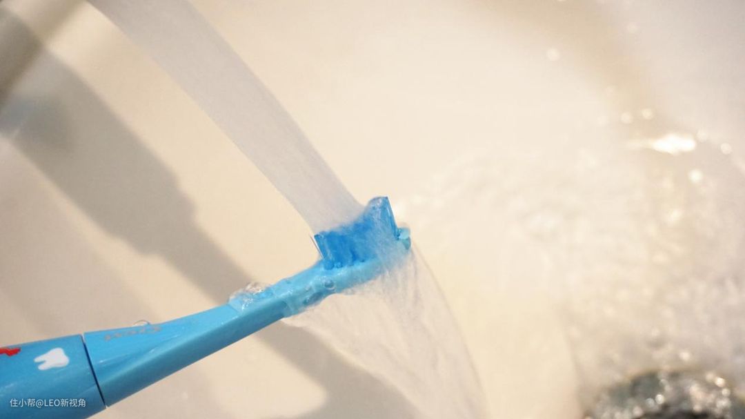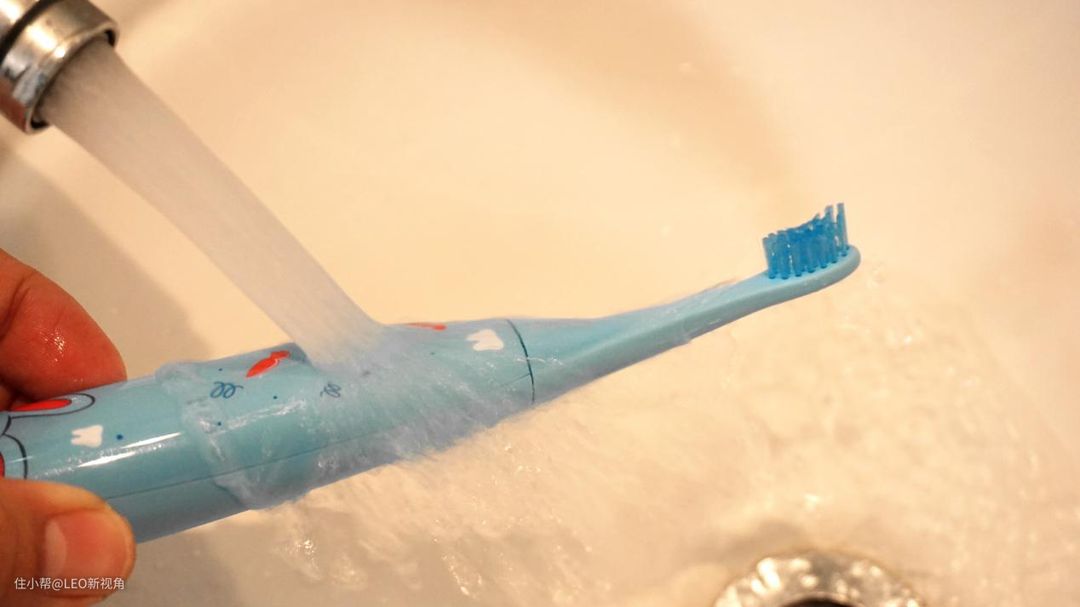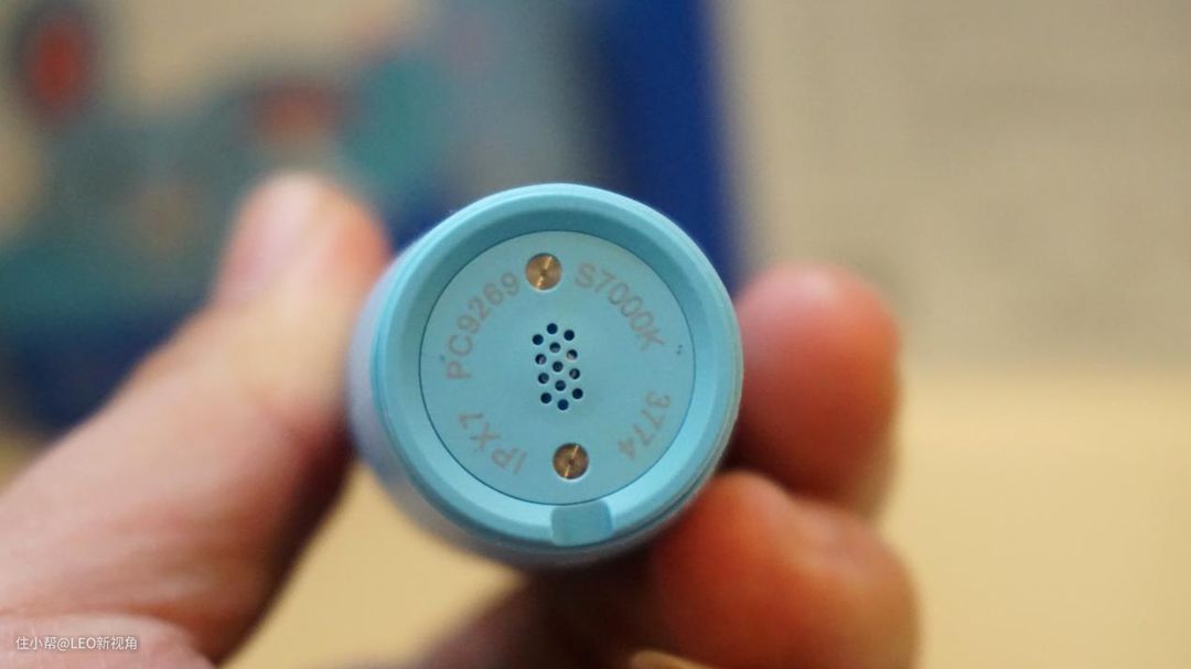 牙刷底部可以看到防水等级是IPX7,底部有两个充电触点,还有一个喇叭孔,其实一直担心这个孔里会进水,不过实测后发现这个担心有点多余。