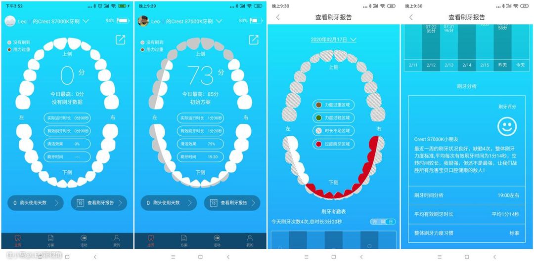 对于孩子来说,刷牙这件事应该是一个学习的过程,在APP上可以一目了然。对于成年来说,我用欧可林时,实话看的并不多,偶尔也会看下分数,但基本可以做到刷牙均匀。而孩子在力度和刷牙的范围,如果是普通牙刷,作为父母很难了解到,到孩子牙齿发黄了,可能已经来不及了。