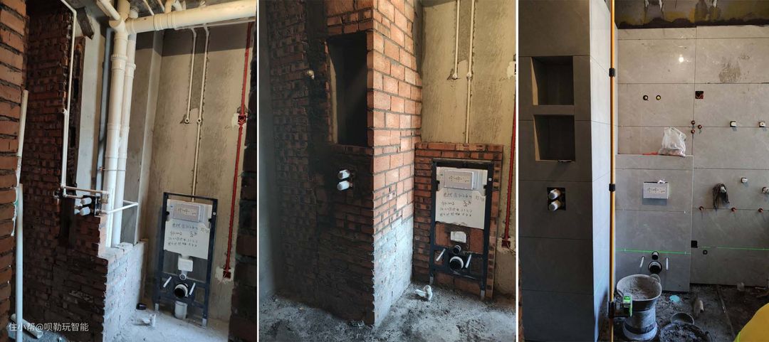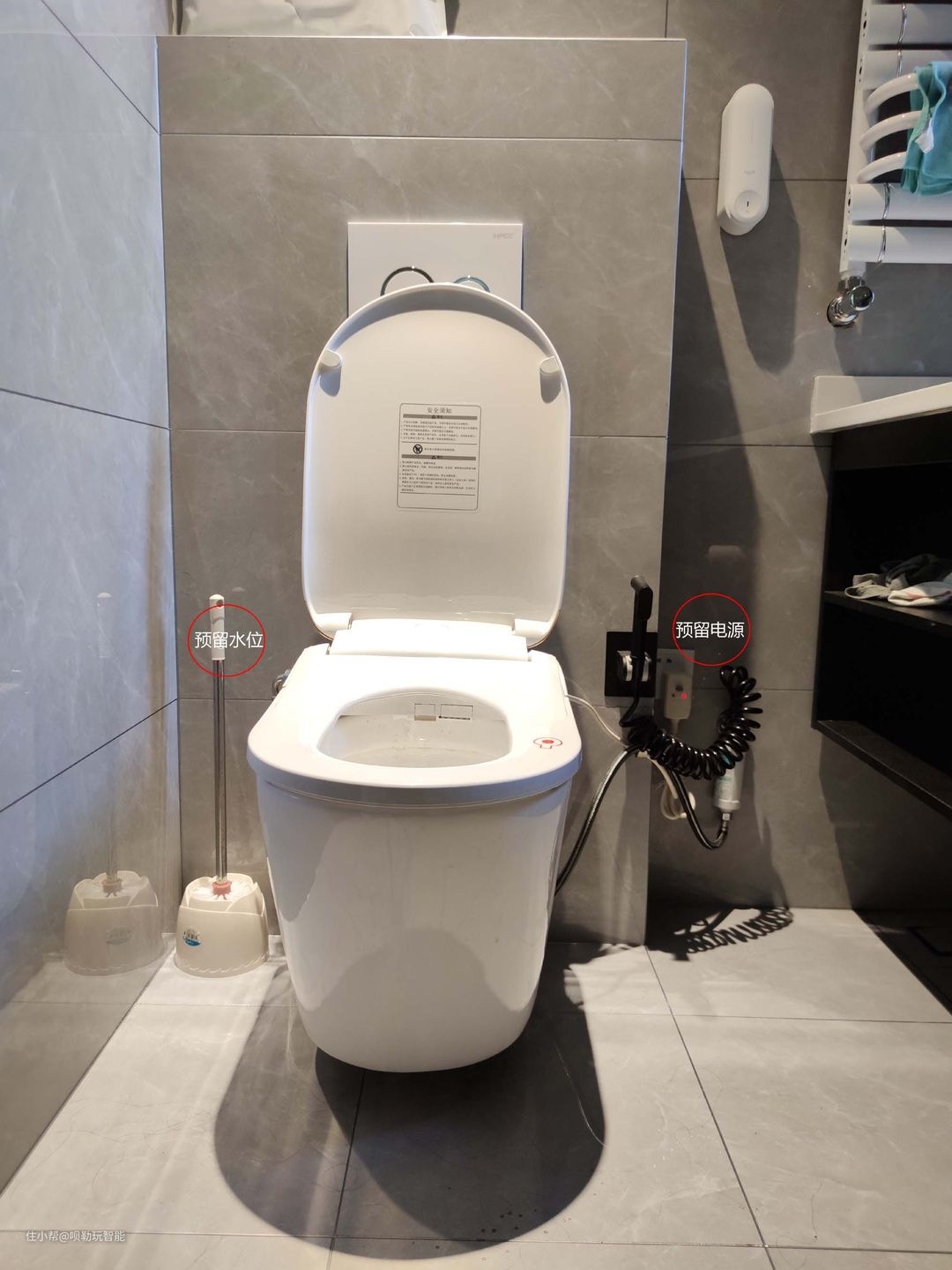 ④切记:需要在马桶的两侧预留电源和水位。一般智能马桶盖是左边水位,右边电源。关于这个我家入了大坑,工人都给预留到了一边。只能用了根加长管,影响了美观性。旁边也需要预留一个手持喷枪的水位。