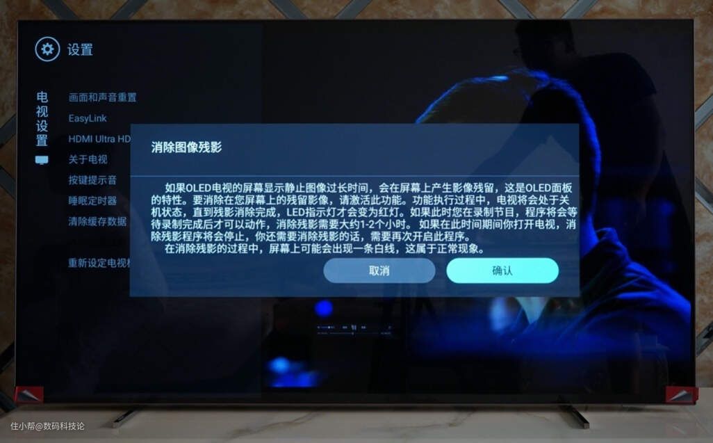 至于静态画面长时间显示会有残影的问题,我也持续点亮屏幕在同一画面下近1小时进行了测试,实际上真没那么明显。而且从合理使用的角度来讲,谁家会把电视机当LED广告牌使用,一天播放一个静态图。如果真感觉残影影响视觉效果了,也可以用系统自带的消除图像残影功能恢复一下就好。