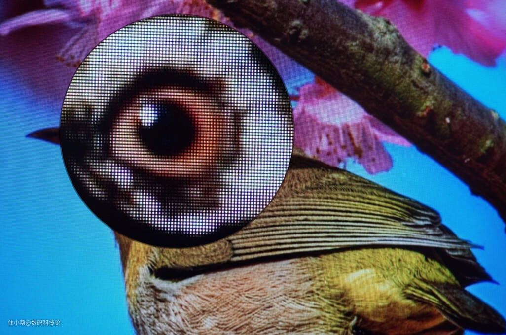 在背景画面放大5倍时几乎是看不到颗粒感的,把画面中的小鸟眼部放大20倍才能看到OLED显示屏的像素点。按照正常人眼视觉来看,就是趴在电视屏幕上看都不一定能看到颗粒感,显示效果真的很赞!