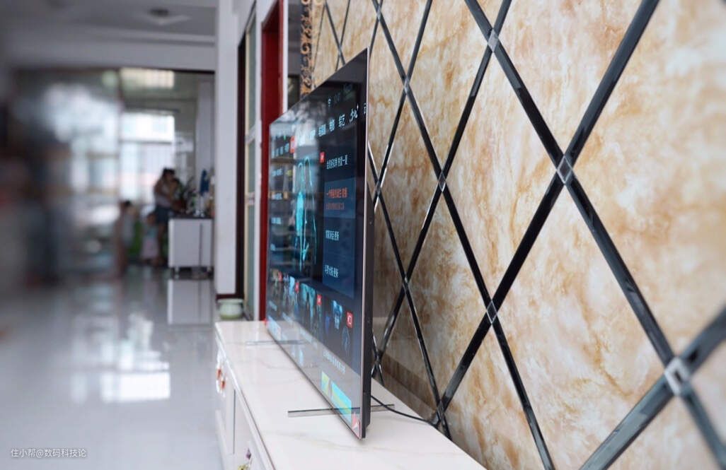另一个特点就是这款电视采用了全面屏设计方案,不仅显示屏边缘包裹更窄,在点亮屏幕的情况下,左、右、上三边黑边框更是窄至6mm。
