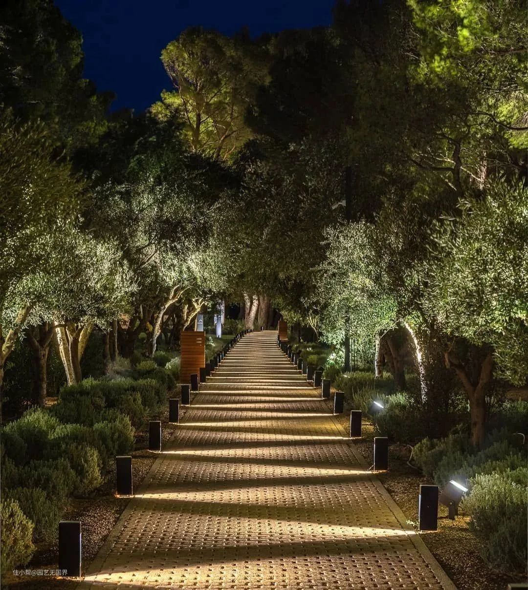 黑夜里的树木也能在可调整角度的低位灯杆和低位灯由下而上的照射中被突出形象,光线摇晃波动,与白天又是不同的情致。