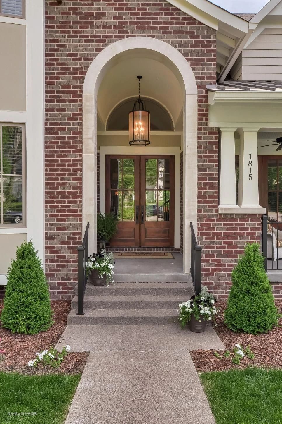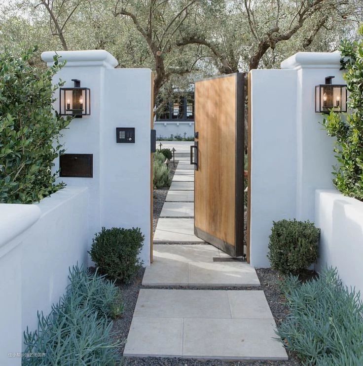 入户灯具的形状、配色等元素,可根据房屋和花园的风格来做具体选择。比如上述的黑色小方灯适合极简和现代风格的建筑花园,如果是欧式、美式等风格的场景,可选择下图的铁艺灯等。