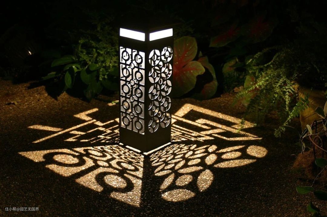 在这种低位灯里面,还有一个有趣且讨人喜欢的种类,那就是镂空灯。白天的时候看起来平平无奇,无非是一个镂空的黑色铁皮盒子。