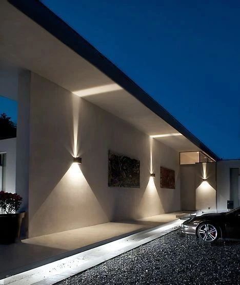 再有这种装饰性洗墙式射灯,灯光形态别具一格,多个灯具组合有很不错的视觉效果,给夜晚的庭院增添不少妙趣。