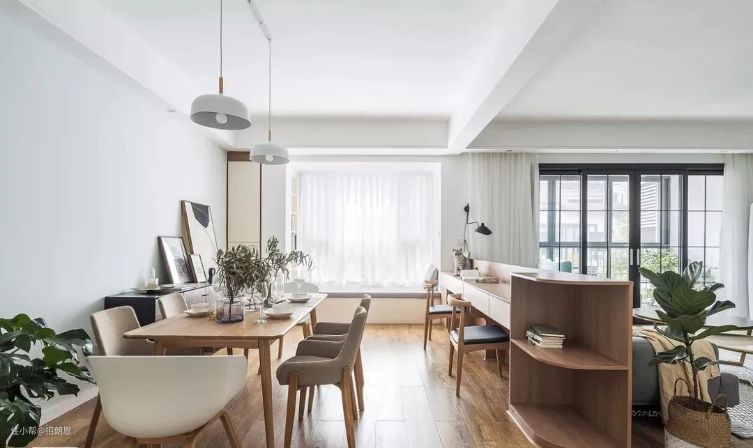 如果觉得这样做太麻烦,也可以利用梁体作为隔断,在梁体下方摆放柜子、桌子或书架,上下呼应,划分不同的功能区域。这样看上去,是不是舒服很多了呢?