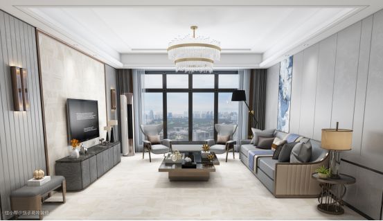 在客厅地面上铺贴了灰调瓷砖,给人以简洁时尚的感觉。搭配线条立体的家具,透露了逼格满满的设计理念。