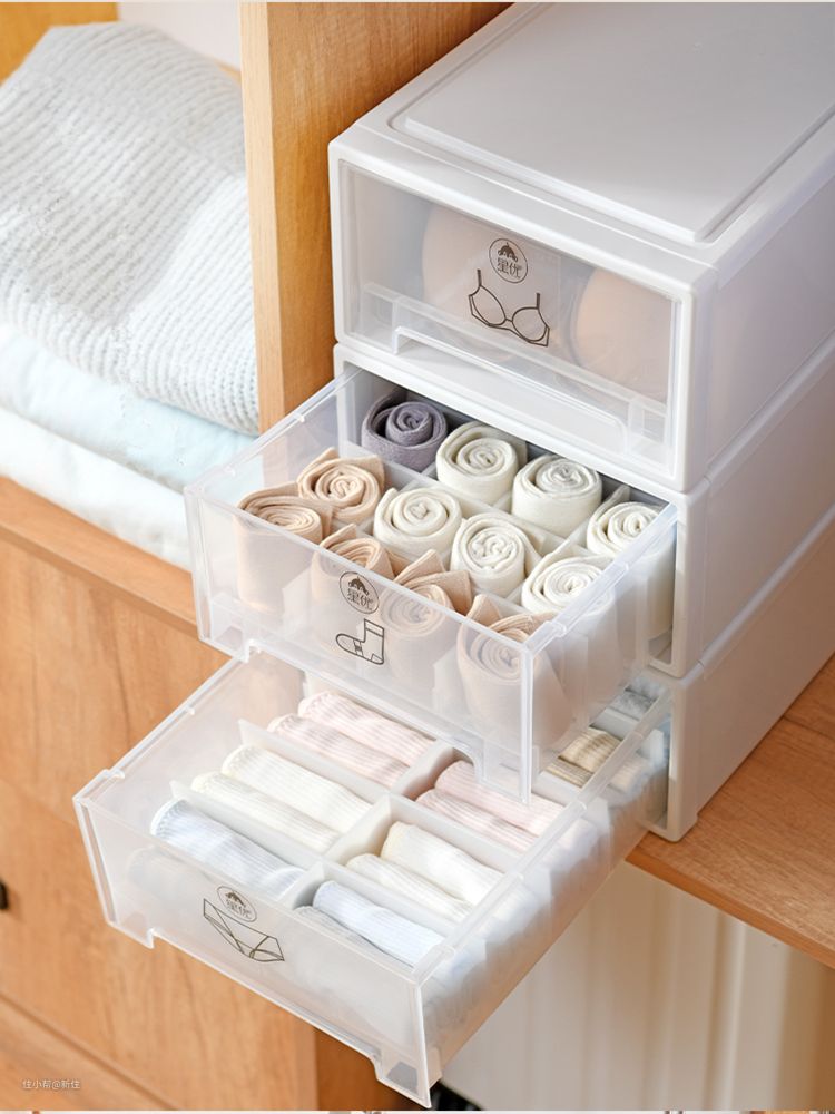如果想比较好的整理内衣袜子,可以选择这种成套的抽屉式内衣、内裤、袜子收纳盒。是比较好的塑料材质,没有异味,承重也好,三个叠加放在柜内,省了不少空间。
