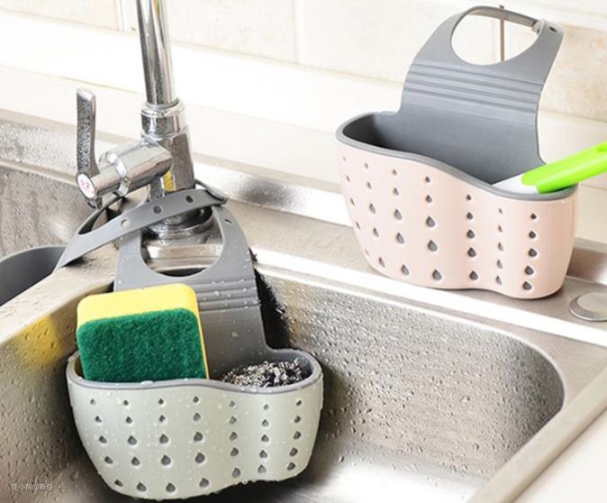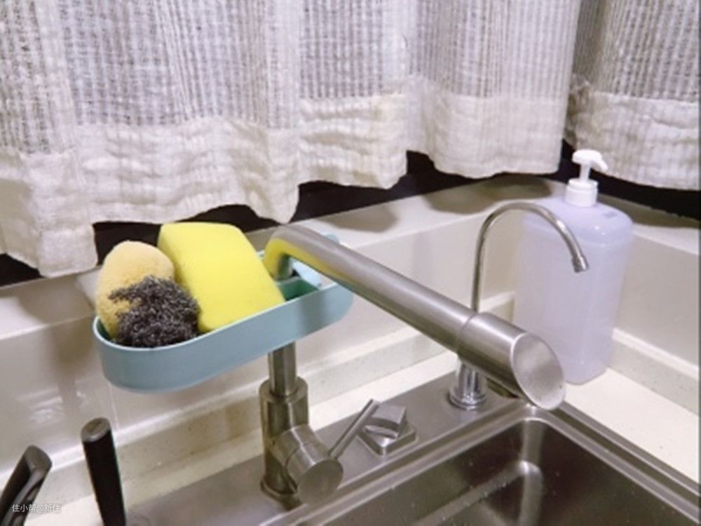 水槽收纳袋几乎每个人家都买过,很便宜真不好用。挂在水龙头上还影响美观,而且因为是收纳袋的设计,底部的孔太小,沥水不及时,里面经常有霉点,很难洗干净。