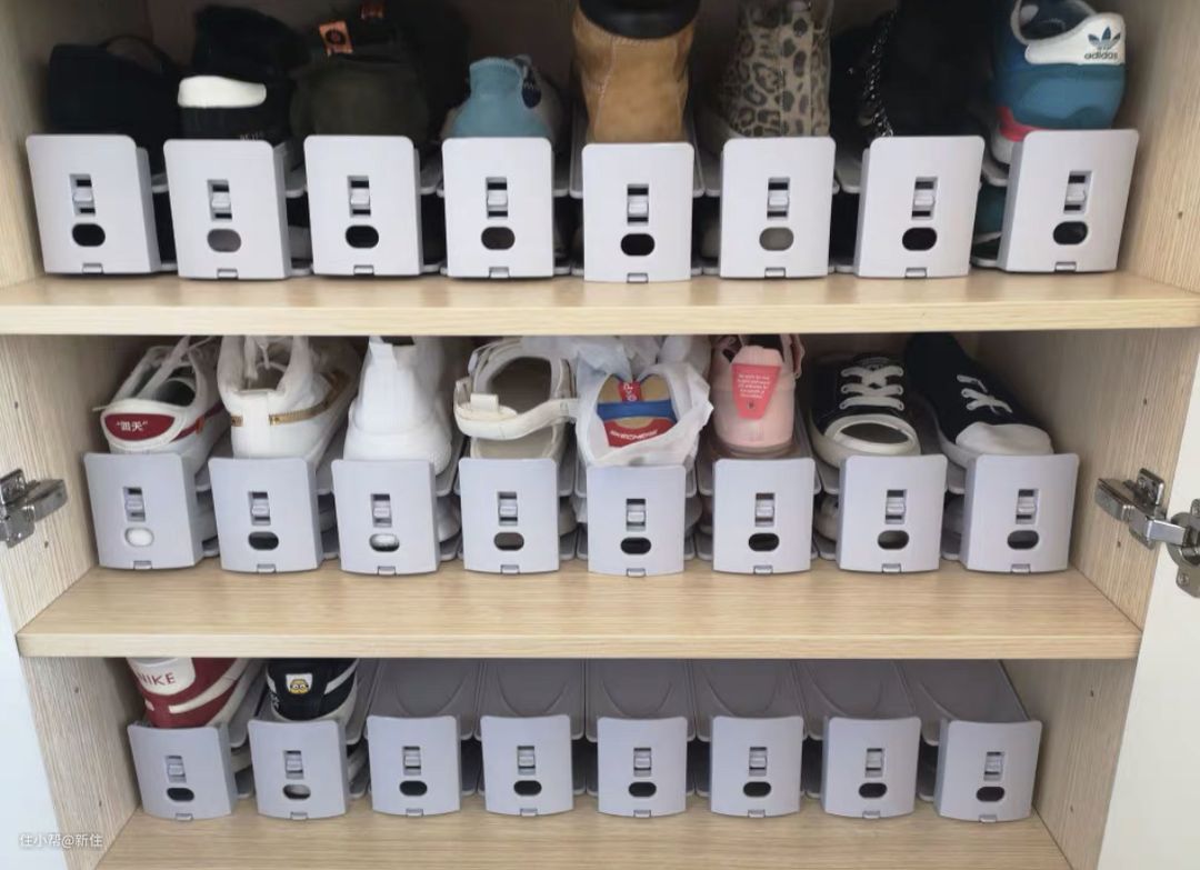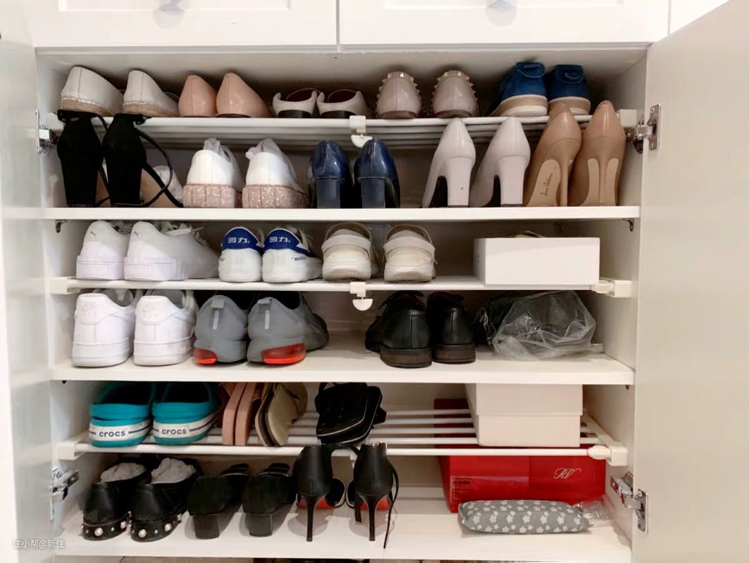 如果鞋柜内部没有装隔板,还可以直接用这种可伸缩的置物架,直接根据自己鞋子的大小合理调整空间,比固定隔板方便省事多了。