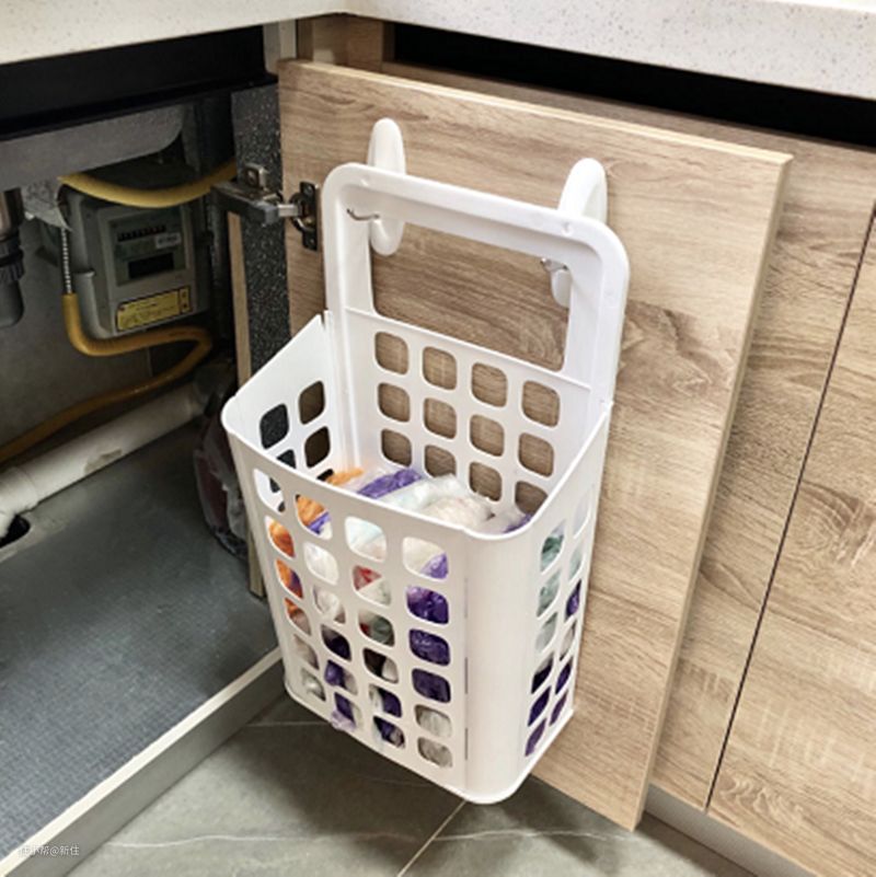 如果大家非要收纳家里的垃圾袋,不妨入手一个宜家的脏衣篓壁挂在橱柜门上,也很便宜,但是不用那么麻烦,直接团成一团丢进去就可以了,找的时候也方便找,柜门关上就看不见,不影响美观。