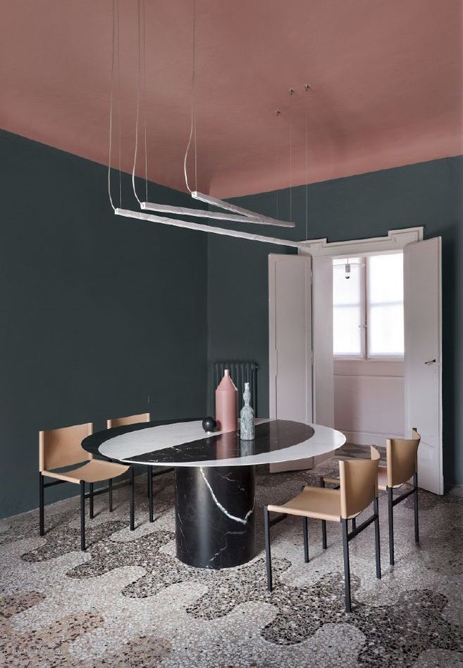 正是因为上述的原因,大面积墨绿色的常常见于房屋设计师的获奖设计,例如下面的房屋设计,墙壁的墨绿色配上大胆的屋顶颜色,经过调色的肉色中和了墨绿色的冷艳,加上偏灰色的墨绿色调色,在保留了墨绿色的质感后增添了些许温暖。