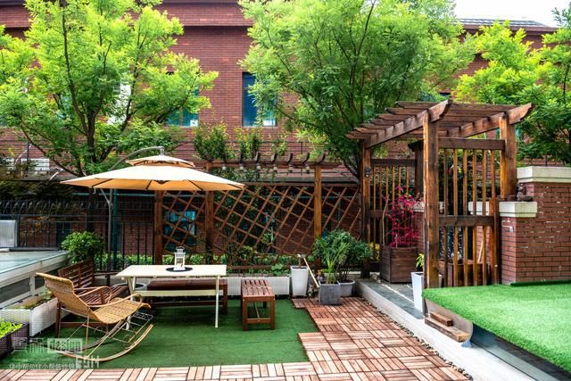 在私家花园中,比较常见的构筑物是藤架。藤架不仅可以充分利用花园的空间,使花园看起来更加丰满,同时又具备一定的功能性,在庭院平台的边缘顺势搭建的木质藤架和花槽,既可以保证平台空间的整体性,也让休闲角落无处不在。整体上看,也是庭院平台不可或缺的一处围挡,可设置木质茶座,作为闲时喝茶看书的地方。