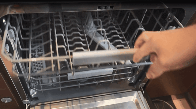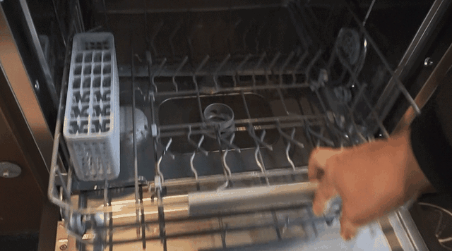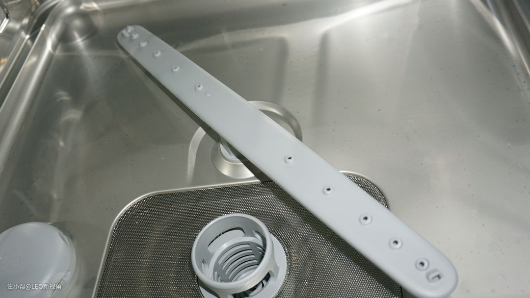 米家洗碗机采用的是3重喷淋,在顶部有一个4孔顶喷结构,相比传统洗碗机,顶喷设计更多了一层喷淋清洗。中间一层的喷淋臂是和拉篮安装在一起的,在工作时,拉篮推到最底部,管子就直接接上出水了,在水压的作用下,喷淋臂就开始转动并清洗了。