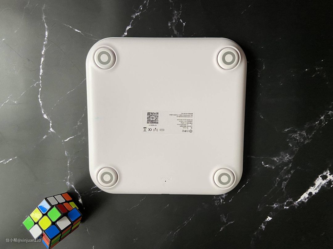 产品的背面朴实无华,纯白配色,有相关的产品参数介绍。同时可以看到这款云康宝Mini心率版体脂秤采用了四角矮秤脚设计,秤脚360°可活动,重心更稳,上称更平稳。