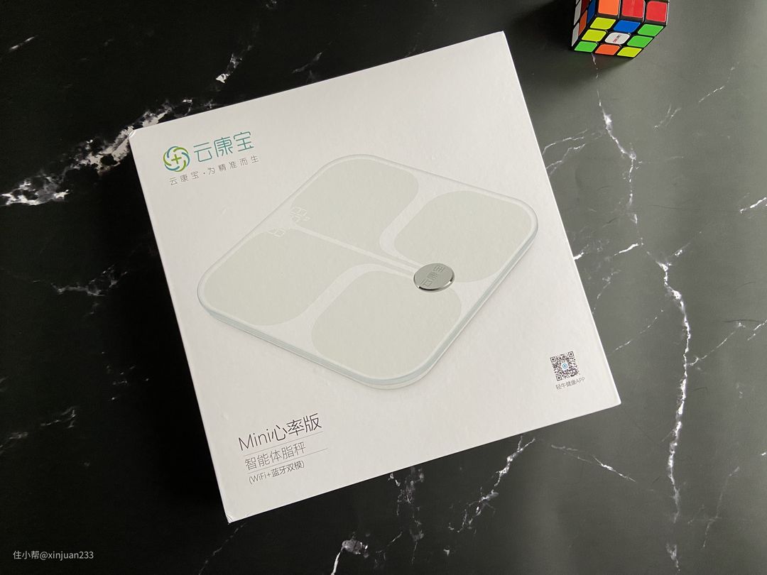 这款云康宝的体脂秤,型号CS20L,外包装设计偏向简约清爽,白色外包装搭配浅绿色字体。外包装正面是云康宝这款CS20L体脂秤的产品照片。左上角是云康宝自己的LOGO,左下角标注了“Mini心率版,智能人体成分分析仪(WiFi+蓝牙双模)”