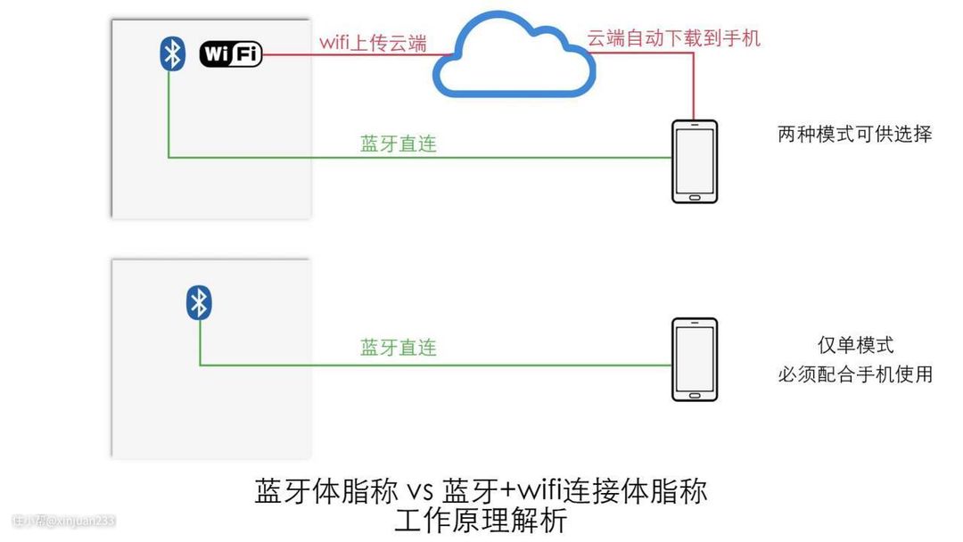 就像图片里所画的,上面就是云康宝Mini体脂秤所采用的WIFI+蓝牙双模模式,下面就是普通的蓝牙体脂称。从图片可以直观的看出,WIFI+蓝牙双模模式提供了一种更加先进,更加方便的使用体验。