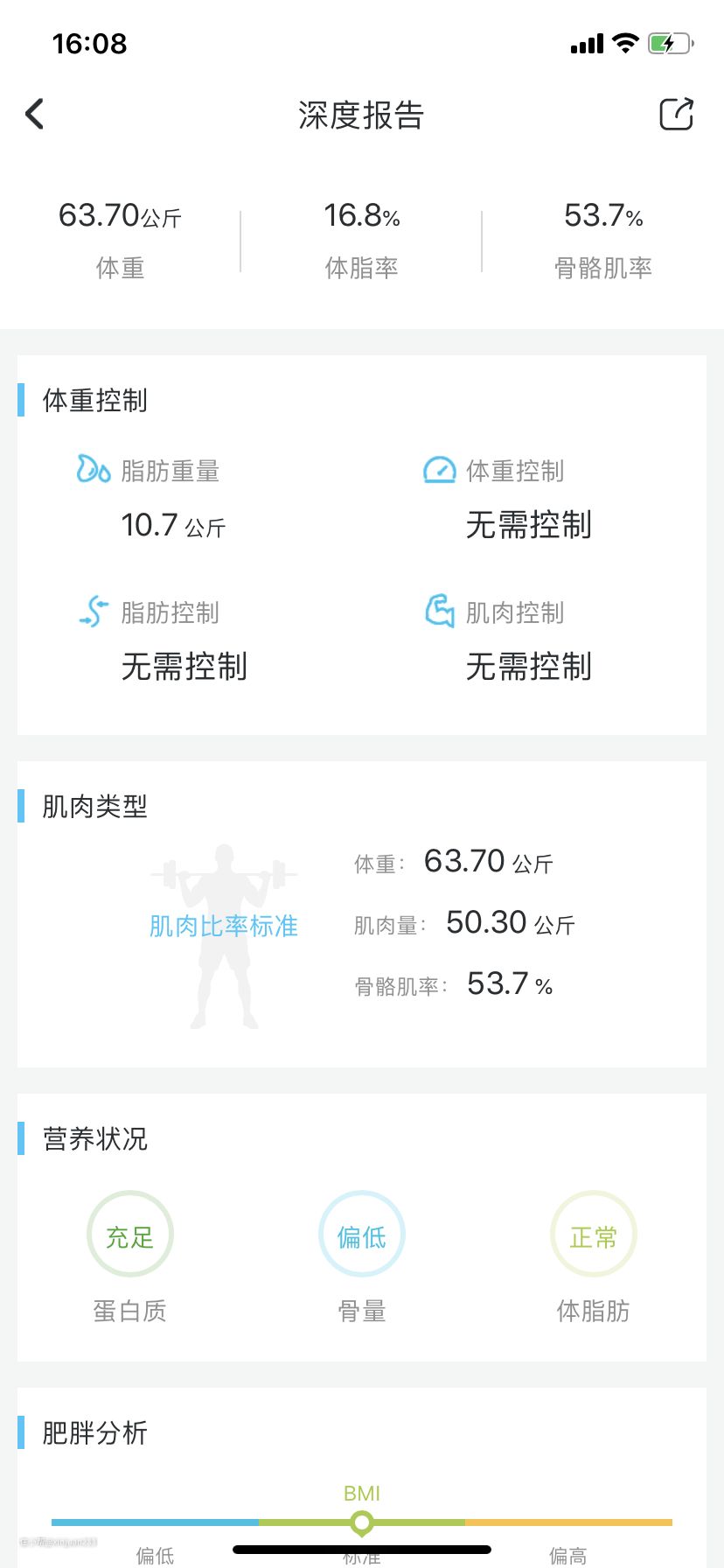 值得一提的是,除了反馈基础数据,轻牛APP还提供了深度报告的功能,可以直观的看到各项数据是否正常,同时提出一定的建议,比如体重控制,肌肉控制等。比如我就是骨量偏低一些,看来我也要好好研究一下。