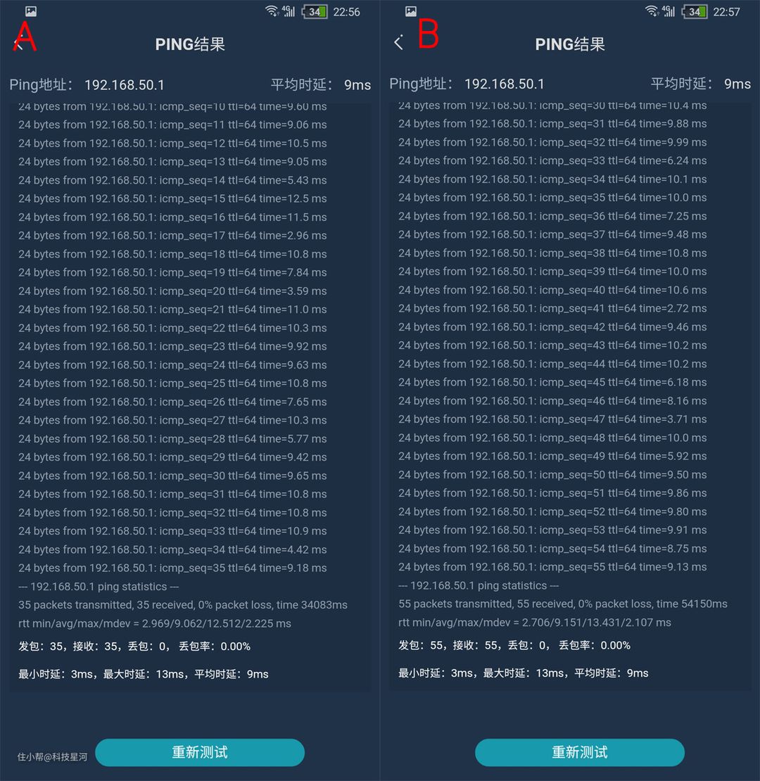 当选择192.168 ping地址时,A、B点的平均时延为均9ms,也都没有发生丢包现象。