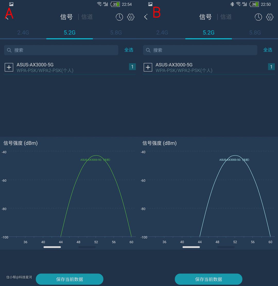 即使在纷纷扰扰的2.4G模式下,无论是测试点A还是B,华硕TUF-AX3000电竞路由器的信号强度都超出其他无线网络设备一大截,鹤立鸡群,是信号拔尖的那一个。