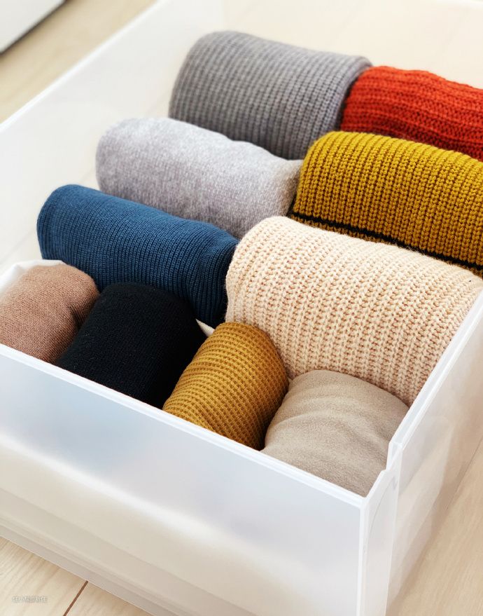 正确整理方式是把衣服折好立起来放进去,像下面的毛衣收纳就是如此,打开一目了然,拿取的时候也不会弄乱其他几件衣服。