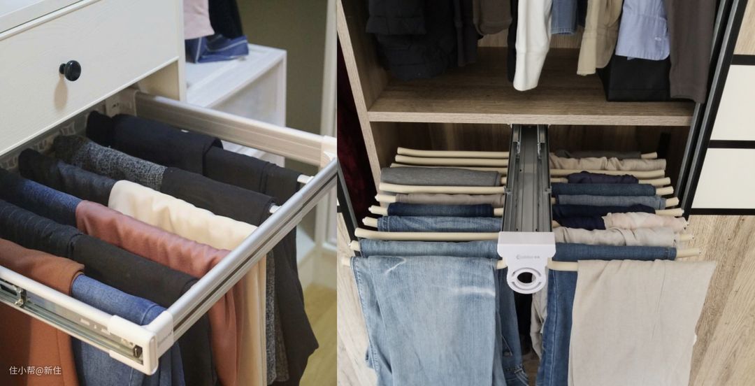 而且我们在摆放裤子时,尽量把常穿的裤子放在前面,不常穿的放后面,一个小细节也能给我们节省时间。