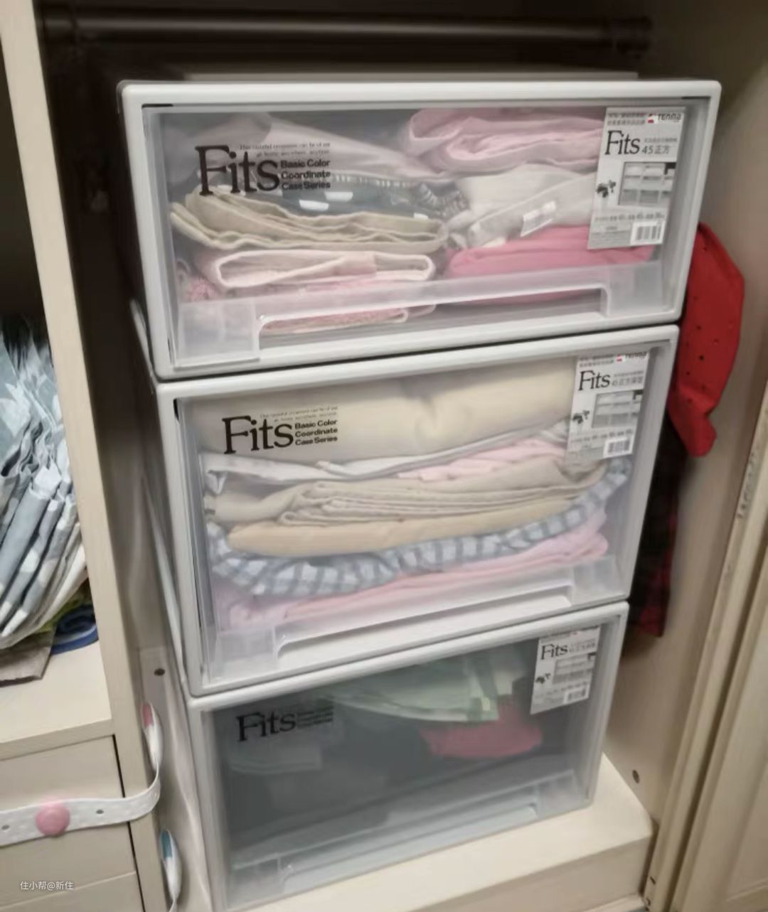 而且使用抽屉式收纳箱的时候,建议贴上标签,标注内部收纳的衣服类型,更方便换季调整哦!
