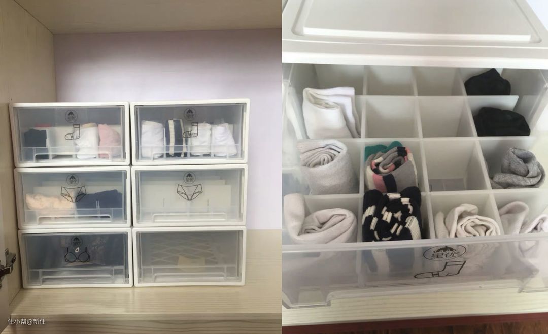 常用的抽屉式收纳盒用来收纳袜子、内衣等小衣物是比较浪费的,因为内部是没有隔断的,自己叠放很难整理。现在已经有专门设计的内衣式抽屉收纳盒,内部有分格,袜子内裤等都更方便放置。