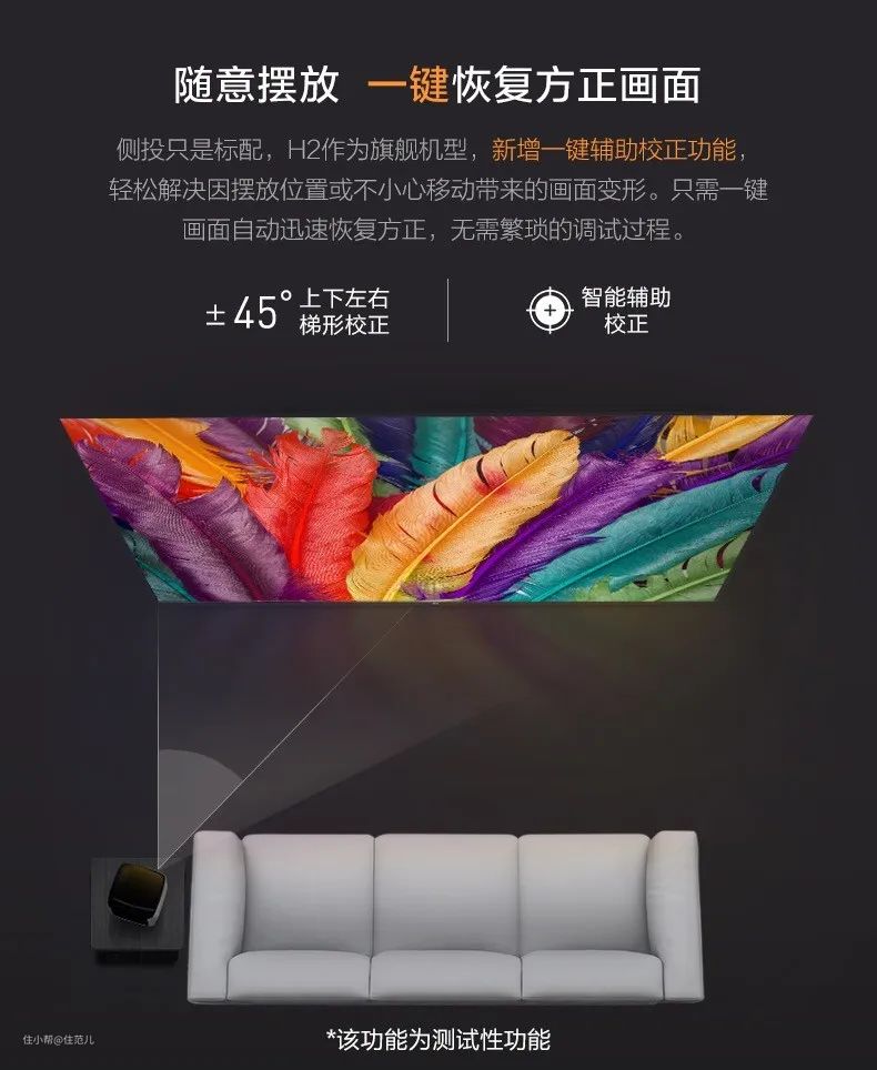 机器带有梯形屏幕校正功能,不需要正对着墙面摆放。