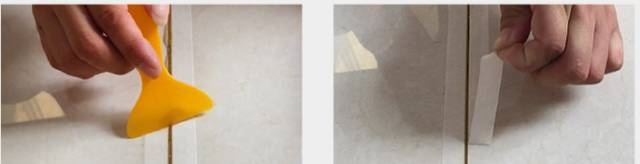 沿着瓷砖缝隙均匀用力挤入美/瓷缝剂,然后用刮板刮平。需要注意的是要及时撕掉美纹纸,因为制剂凝固较快,美纹纸不及时撕下会造成两种情况: