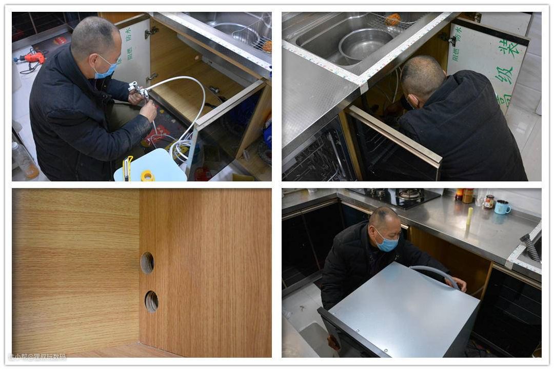 疫情期间师傅戴口罩上门,由于是一体机所以米家洗碗机的安装非常简单,接通电源和水路,然后将洗碗机装入橱柜内固定螺丝即可,有工具的话自己也能搞定。师傅先开了三个孔,然后麻利地接通了水路和电路并将洗碗机固定好,最后开机测试,整个过程也就二十几分钟。我家装的有小米净水器,然后师傅在原有净水器的三通上又接了个洗碗机的三通,不影响使用,最后还帮我换了一个新的角阀,最后走时现场也没有留下任何垃圾,点赞。