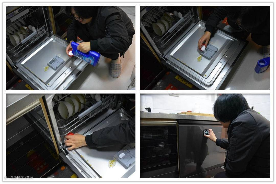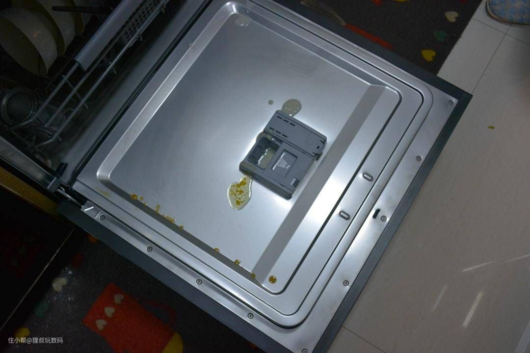 看看油污满面的门内侧现在知道下拉开门的好处了吧,除了取放物品方便外还能避免汤汁菜液流到地板上。如果是初次使用的话我们需要向洗碗机内加入软水盐、漂洗剂和洗碗粉,洗碗粉需要每次使用前添加,软水盐和漂洗剂只需在耗尽时添加即可。洗碗粉以瓶盖为单位每次加入一瓶盖,粉盒内半盖,洗碗机底部半盖,需要注意的是向粉盒内加洗碗粉后一定要盖好盖子,添加完成后我们关闭柜门开启标准模式静待洗碗结束就好。