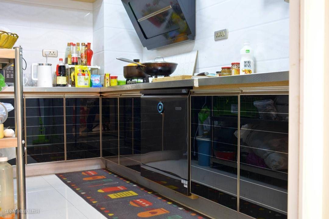 这就是装好后的样子,深灰色的镜面柜门和我家橱柜搭配效果还不错吧,就是房间小不太方便拍照。之前这个位置装的是消毒柜,完美替换。可以看到米家洗碗机在操作控制上不同于传统洗碗机的按键面板设计,两个按键加上一个极简的OLED旋钮一转一按就能轻松掌控多种洗涤模式。