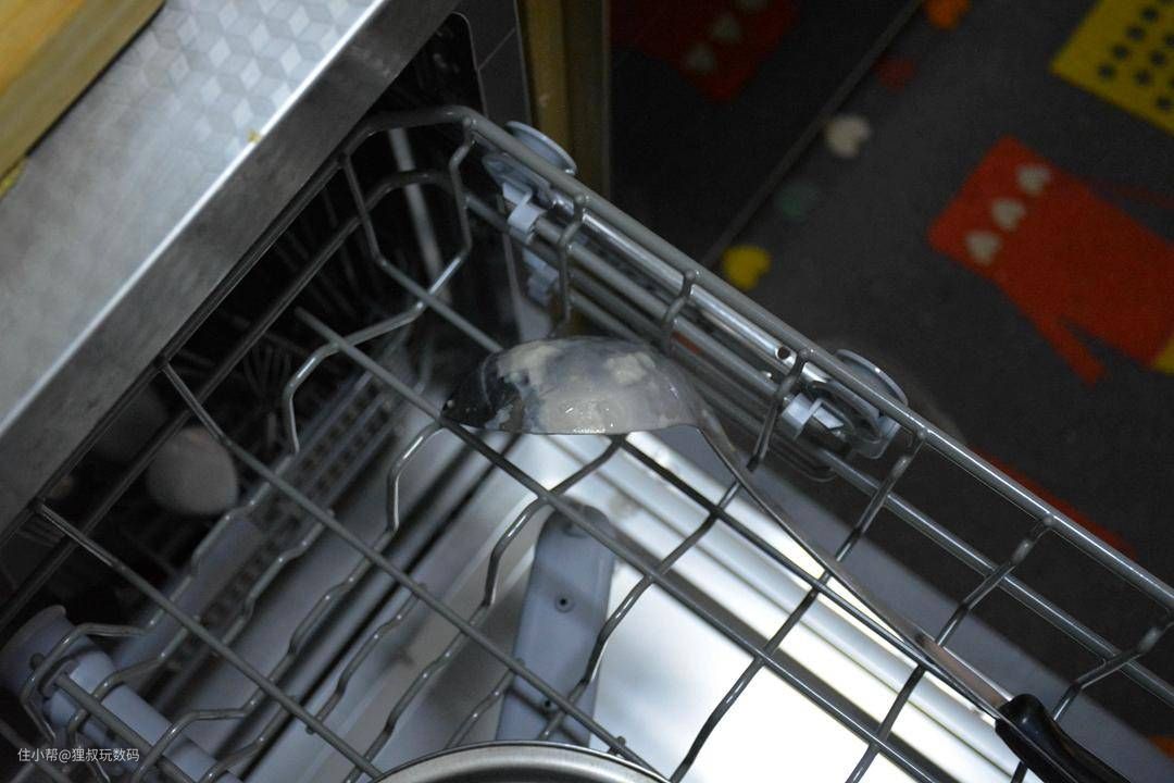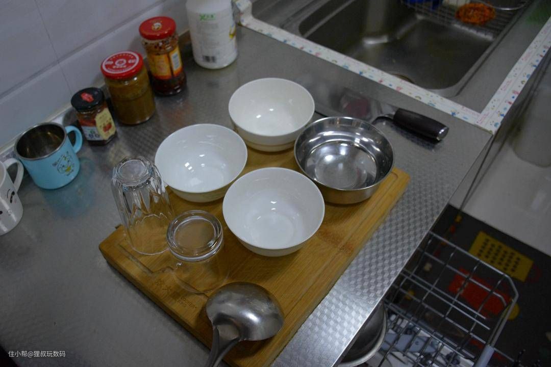 开始测试洗碗效果,今天的晚餐我做了抖音上最近比较火的神仙吃法 —— 日式方便面炒饭,先暴力捏碎自己喜欢的泡面,然后倒入调料包加入开水,接着我们起锅炒鸡蛋、火腿肠和大白米,翻拌均匀后倒入泡好的泡面翻炒均匀出锅就好啦,味道超级好,感兴趣的小伙伴可以试试哈,这大晚上的就不给大家放美食图片了。这是吃完饭的狼狈样,油污比较大,小钢盆是盛剩米用的所以有结痂和米粒若干,特别是盛汤的勺子上还有满满的面糊包裹,把所有要清洗的餐具摆入洗碗机后我们进行下一步。