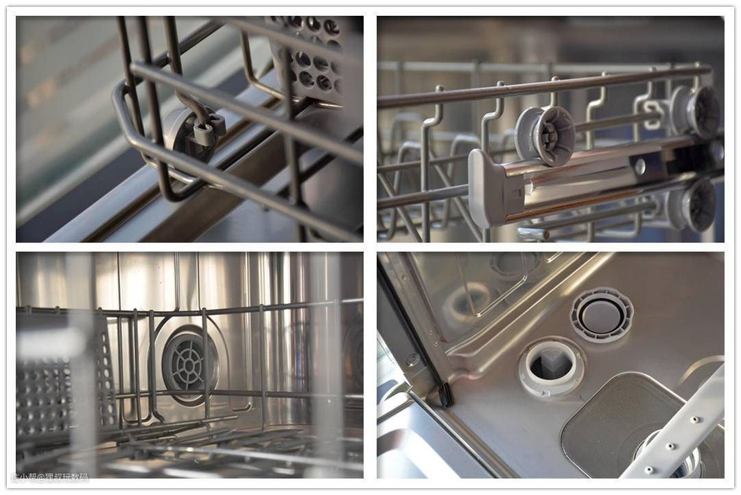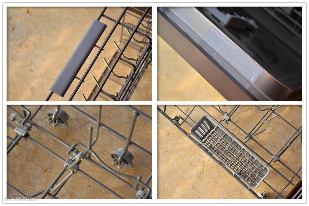 这是洗碗机内部细节做工,我们还是先来说说配置吧,米家一贯是顶配低价,让每个人都能享受到科技带来的乐趣,所以这款互联网洗碗机依然是配置高端价格实惠。首先它集洗、消、烘、存于一体,支持小爱同学语音控制,即便是在占用双手的同时还可以通过语音控制让洗碗机工作;然后配置了高端机才有的顶喷结构,重新设计了6D3层螺旋水路系统,并在28个出水孔中设计了13种出水角度,形成相互交错的360°网状水路,全方位覆盖所有碗碟,达到更彻底的清洁效果;接着容量足够大,上下双层能够放入64件餐具,让全家人的餐具轻松收容。而且洗碗机内胆六面全部采用不锈钢,连门上都是一整块不锈钢,耐腐蚀、耐高温,食品级材质用着才更放心;最后细节做工也非常值得表扬,就拿上下碗篮来说每根线条上面都有软胶包裹,在减少磕碰损坏的同时更能有效避免生锈等现象发生。
