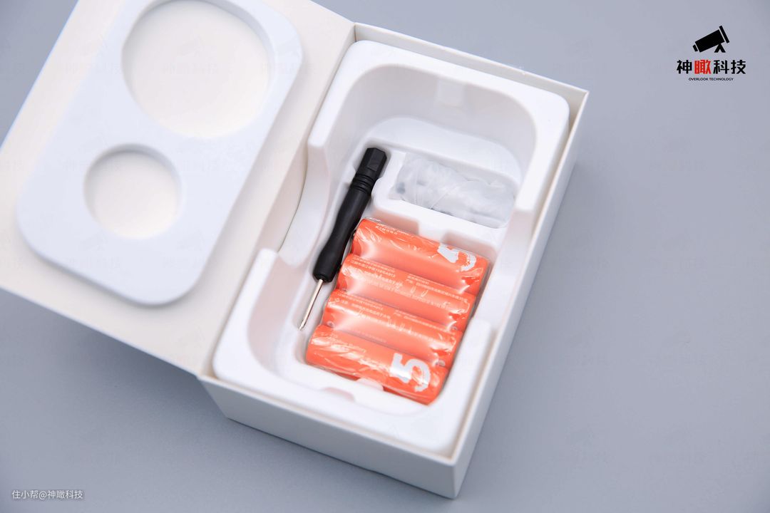 视频门铃由主体、电池、防盗螺丝、螺丝刀、门铃贴纸、说明书构成。