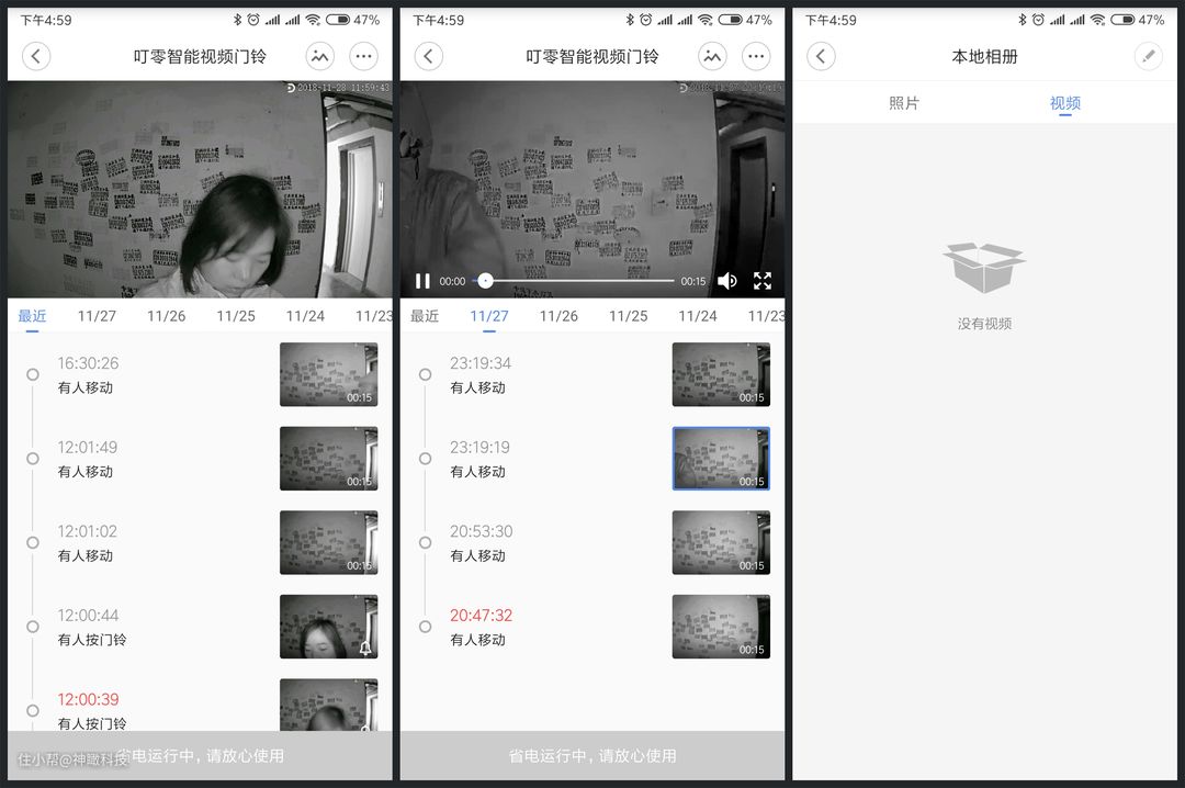 门铃采用了4节5号干电池供电,辅以智能低功耗实现了门铃的超长续航。当按下门铃或移动触发门铃时,门铃会启动摄像机拍摄并完成视频上传,随即进入低功耗模式。