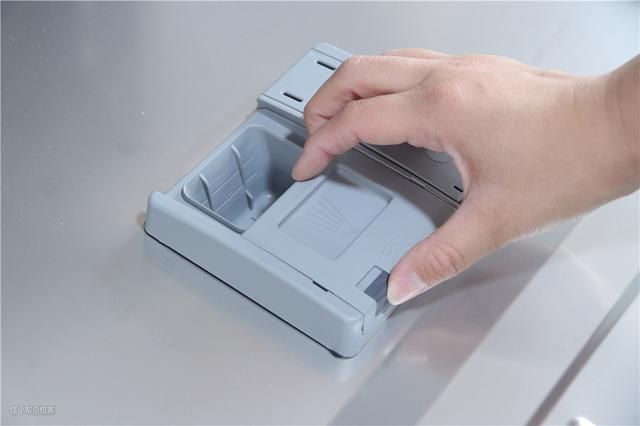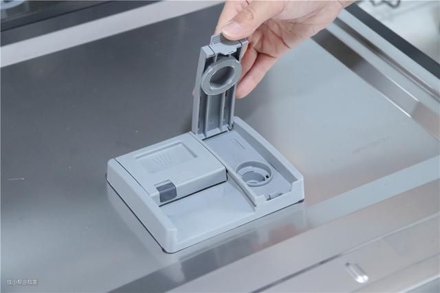仓门内侧,配置了一个较小的储物格,是添加洗碗粉和亮碟剂的添加处,左侧是放洗碗粉的,右侧是添加亮碟剂的,洗碗粉每次使用每次添加就行,漂洗剂一次添加多次使用。漂洗剂可以减少水表面的张力,再配合转换后的软水,这样就可以有效的避免洗涤后留下的水迹,使餐具表面保持光泽。
