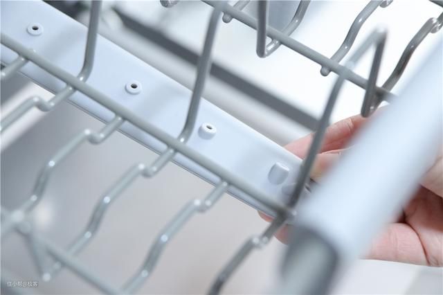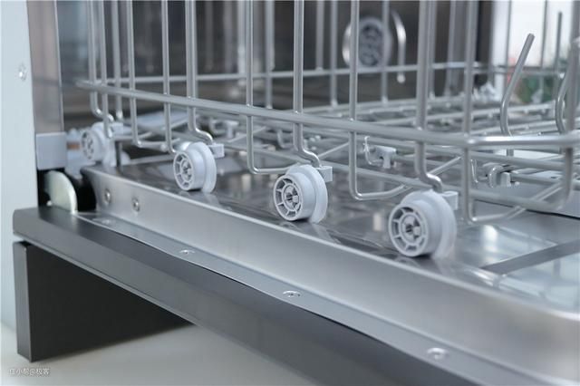 洗碗机内部的储物设计分为上下两层碗篮设计,上层主要放置一些偏小的餐具,比如水杯,碗碟之类的。下方碗篮就可以放置一些较大的餐具, 空间非常的富余,毕竟它的规格是八件套的了。在碗篮的每根金属条表面,还有着软胶的包裹,这个软胶是食品级别的,大可放心。可以有效的减少碗筷的磕碰和生锈的情况。