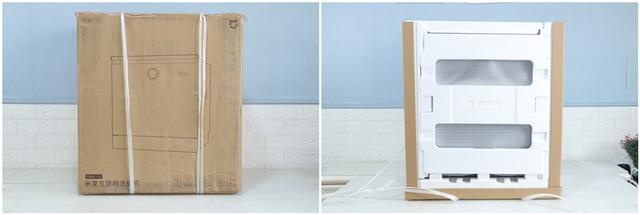 这款米家互联网洗碗机采用了常用的牛皮纸箱,外有扎带方便搬运,打开包装,可以看到机身的周边全部被泡沫包裹,上面还有木条固定,保证了安全运输。
