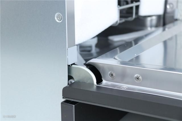 为了方便用户推拉,碗篮两侧还设计了硅胶滚轮,抽拉的时候非常省力,而且还没有噪音。在轨道的尽头还设计了一个小的阻挡设计,这样就不会因自己的误操作而导致碗篮全部滑出的情况发生了。