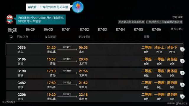 订车票也很简单,比如小编这样跟它说"帮我订一张青岛到北京的火车票",小聚便会马上找出当天的车票信息,找到想要预定的车票,只需要再次说出序号,就可以帮你预定了。只需要动动嘴,就能预定车票,有没有被这个功能震撼到!